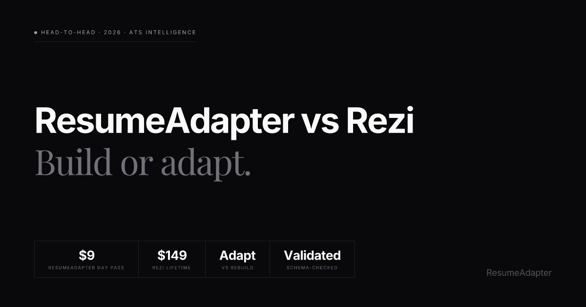 - Build vs AdaptRezi is a builder. ResumeAdapter is an adapter. If you are starting from a blank page, Rezi is genuinely strong. If you already have a resume that mostly works, rebuilding it from scratch in a new editor is the wrong unit of work.