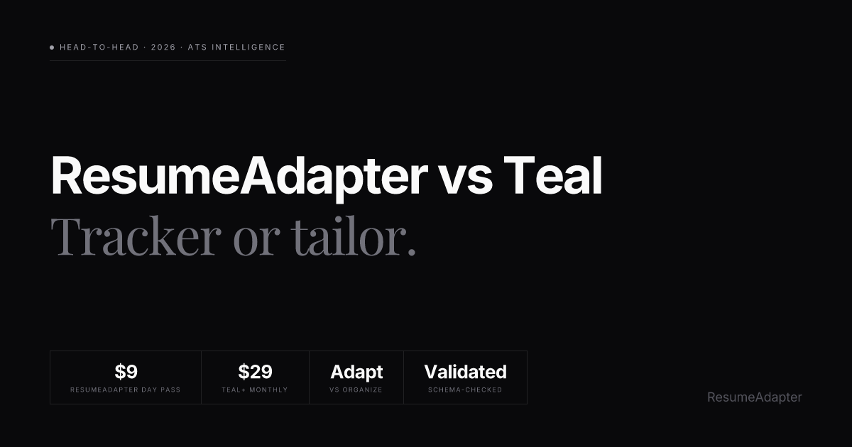 ResumeAdapter's $9 one-time day pass was built for the focused sprint where every application has to count. Use Teal for the spreadsheet. Use ResumeAdapter for the resume.
